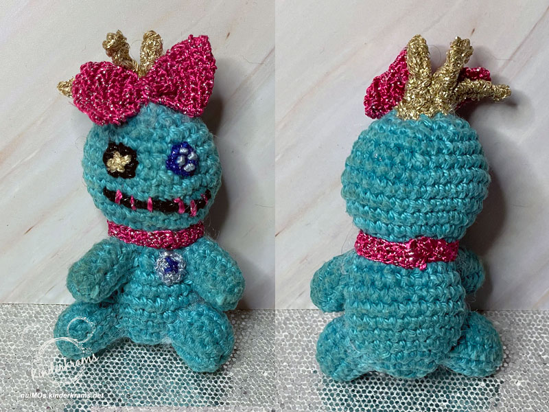Lilo hat Scrumpy selbst für ihren geliebten Stitch genäht. Deswegen ist er so besonders. Diesen Scrumpy habe ich für Stitch gehäkelt. Wie man auf dem Bild sieht, hat mein Hund Schroeder zuerst besonderen Gefallen an ihm gefunden ;-), so dass er schon ein paar Abenteuer gleich nach der Geburt erlebt hat.