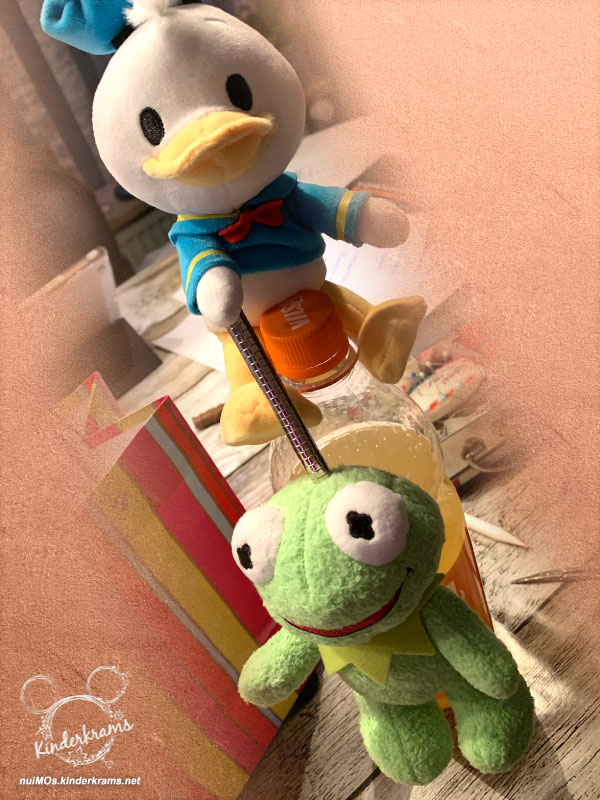Donald fand das mega witzig, ketterte auf die Limoflasche mit einem sehr starken Magnete und überraschte Kermit von oben: Schwups… da schwebte Kermit in der Luft und Donald kicherte los. … Na hoffentlich macht er das nicht auch mal bei Daisy, sie wird das vielleicht weniger witzig finden als Kermit 😉